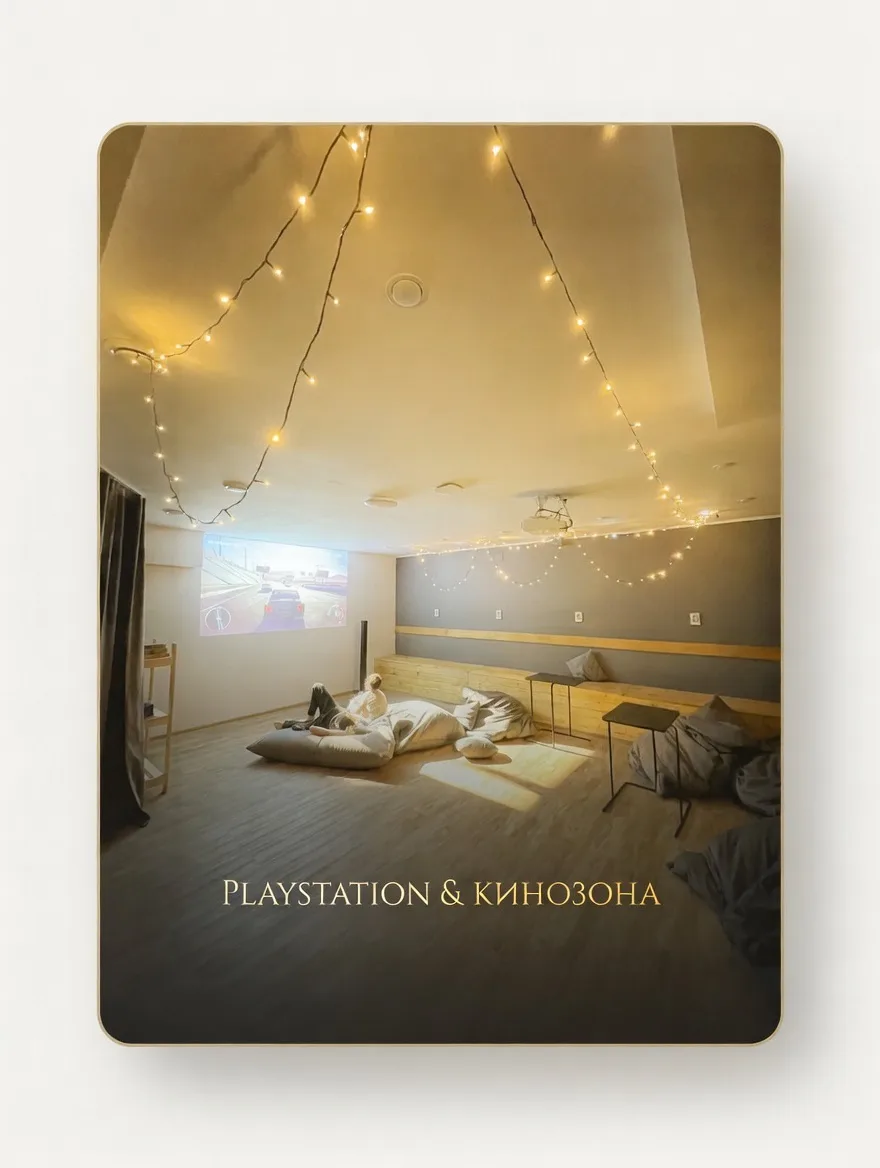 Для любителей активного досуга мы создали целый мир развлечений: мангальная зона, где вечерами царит особая атмосфера дружеских посиделок; современный кинотеатр для захватывающих киносеансов; PlayStation для азартных геймерских сражений; просторная игровая зона с настольным теннисом, шахматами и бильярдом.